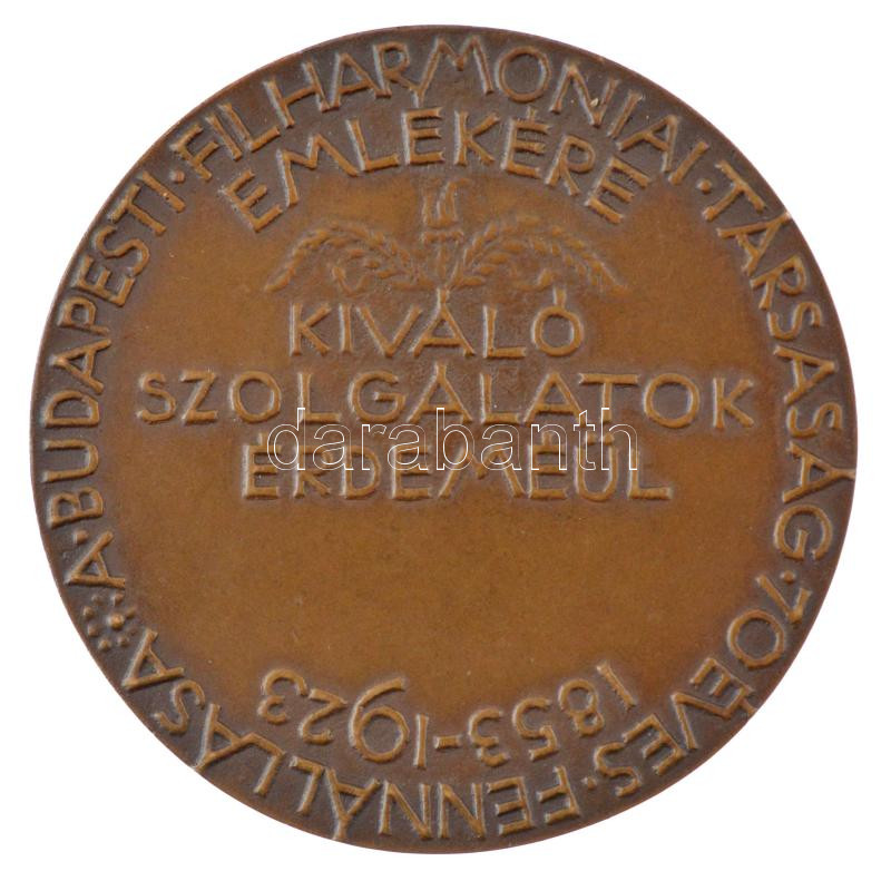 Description: Reményi József (1877-1977) 1923. "Erkel Ferenc a Filharmóniai Társaság Alapítója / A Budapesti Filharmóniai Társaság 70 éves fennállása 1853-1923 - Kiváló Szolgálatok Érdeméül" bronz emlékérem (61mm) T:1