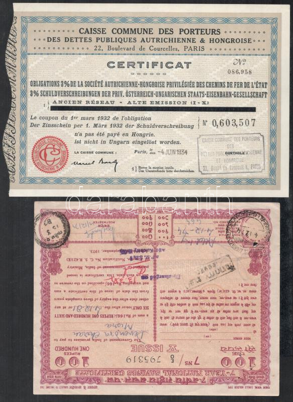 4 darabos külföldi részvény tétel berakókban, közte "Caisse Commune des Porteur" ,"7-year national savings certificate" vegyes állapotban