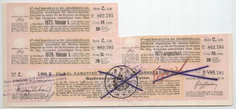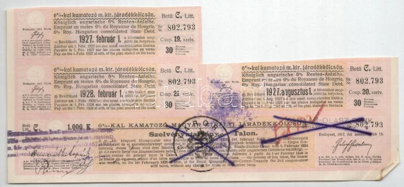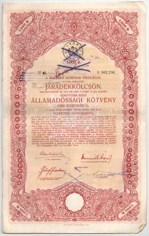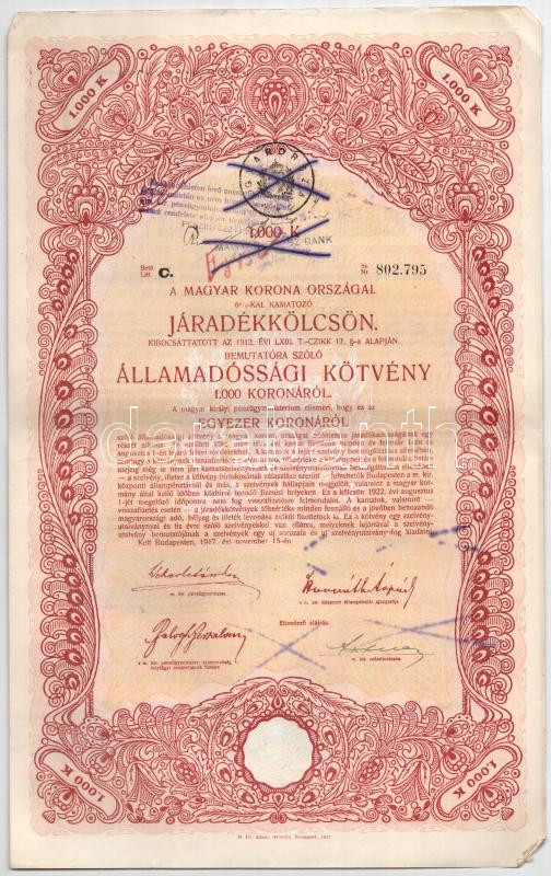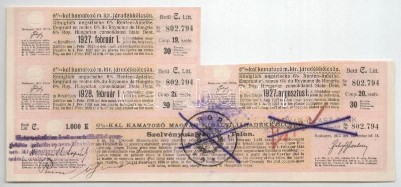Budapest 1917. "A magyar korona országai 6%-kal kamatozó Járadékkölcsön" államadóssági kötvénye 1000K-ról (4x) sorszámkövetők szárazpecséttel, szelvényekkel, áthúzással érvénytelenítve T:III beszakadás, sarokhajlás