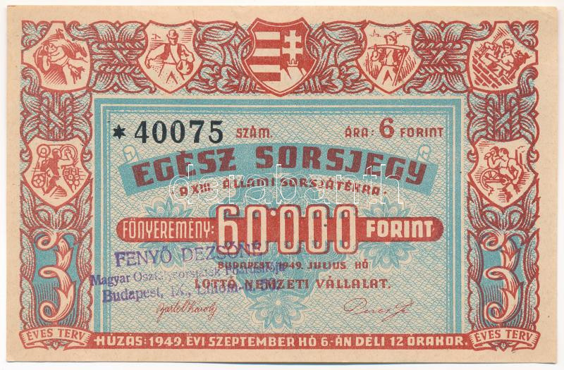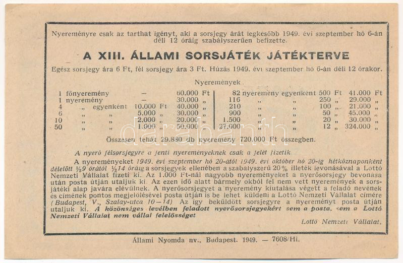Budapest 1949. "XIII. Állami Sorsjáték" egész sorsjegy, felü...