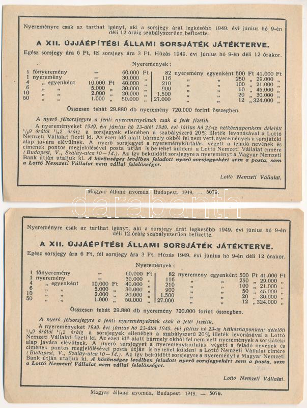 Budapest 1949. "XIII. Állami Sorsjáték" fél sorsjegy, felülbélyegzéssel, vízjeles papíron (2db: A és B sorozat) T:I-