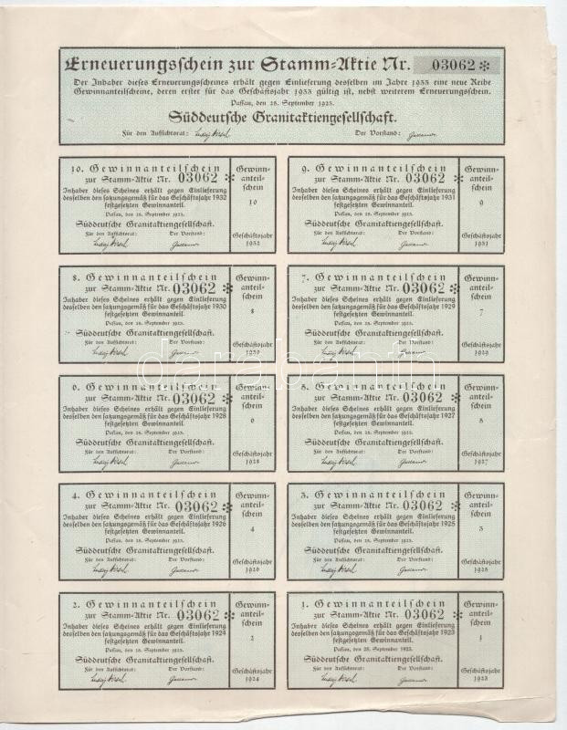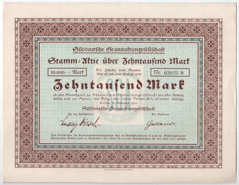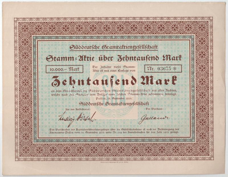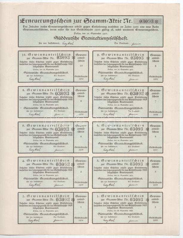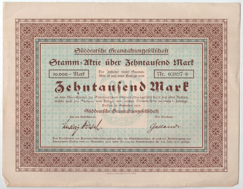 Passau, 1923. "Dél-német Gránit Részvénytársaság" 10.000M-ról szóló részvénye (4x), ebből 2 darab szelvényekkel T:I-,II közte hátoldalon firkálás, beszakadás, anyaghiány, szép papír Passau, 1923. "South German Granite Joint Stock Company" stock for 10.000M (4x), 2 with coupon C:AU,XF include scribbles, tears, lack of material, nice paper