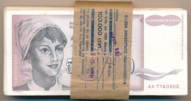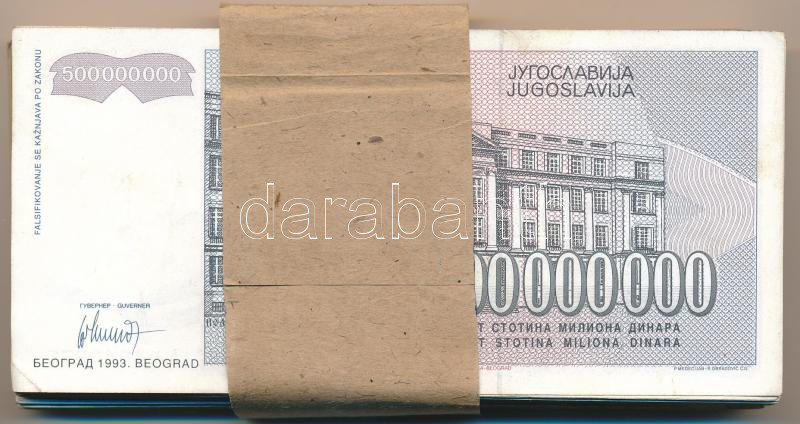 Jugoszlávia 1993. 500.000.000D (100x) eredeti, nem saját banki kötegel... https://www.darabanth.com/en/436-Online-auction/436.0/Numismatics/Worldwide-banknotes~2500001/Jugoszlavia-1993-500000000D-100x-eredeti-nem-sajat-banki-kotegelovel-TIII-Yugoslavia-1993~II2824559