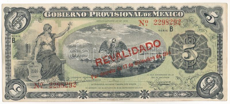 Mexikó / Gobiernói Ideiglenes Kormány / Mexikóváros 1914. 5P piros &qu... https://www.darabanth.com/en/436-Online-auction/436.0/Numismatics/Worldwide-banknotes~2500001/Mexiko-Gobiernoi-Ideiglenes-Kormany-Mexikovaros-1914-5P-piros-REVALIDADO-felulbelyegzC3~II2833863