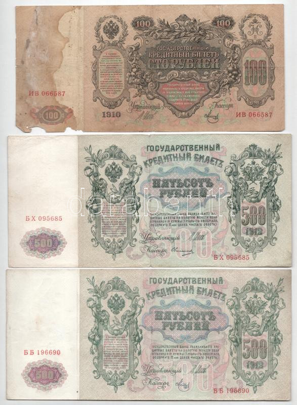 Description: Orosz Birodalom 1910. 100R Szign.: Shipov + 1912. 500R Szign.: Shipov (2x) T:III,III- szakadás, az egyiken folt és anyaghiány