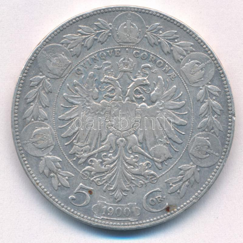https://www.darabanth.com/en/436-Online-auction/436.0/Numismatics/Worldwide-silver-and-metal-coins~2500002/Ausztria-1900-5K-Ag-Ferenc-Jozsef-T3-karc-ph-Austria-1900-5-Corona-Ag-Franz-Joseph-CF-scr~II2824704