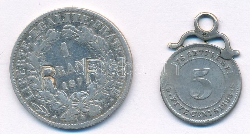Description: Franciaország 1872A 1Fr Ag "R F" beütéssel + Straits Settlements / Brit Malajzia 1898. 5c Ag "Viktória" füllel T:2-