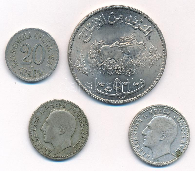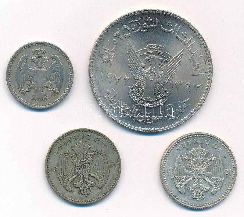Description: Szerbia 1884. 20p Cu-Ni + Jugoszlávia 1931. 10D Ag "I. Sándor" (2x) + Szudán 1972. 50q Cu-Ni "A május 25-ei forradalom 3. évfordulója" T:2-3 patina