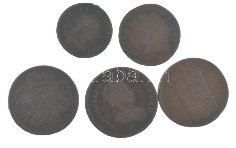 Description: Vegyes: 1765-1782. 5db klf rézpénz, közte Olasz Államok / Milánó 1777S 1S Cu "Mária Terézia", Ausztria 1781A 1/4kr Cu T:3