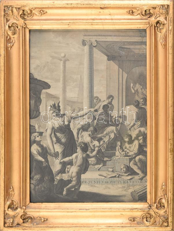 Description: cca 1700 Francisco Junius: De Pictura Veterum c. könyvéből ábrázolás. Rézmetszet, papír, jelzés nélkül. Kissé sérült. Dekoratív, üvegezett historizáló fakeretben. 32,5x23 cm.
