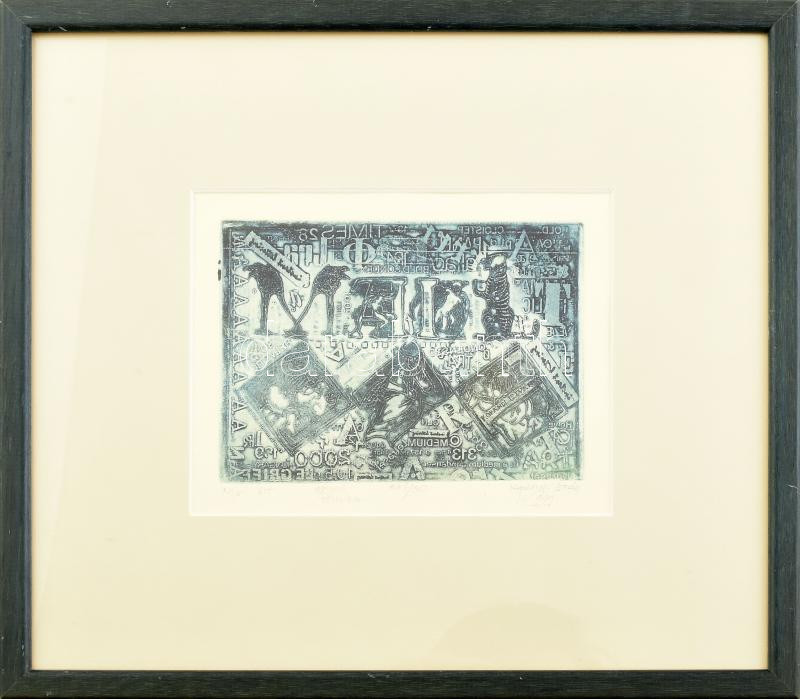 Description: Kopándi István (1968-): Mail art, 1999. Egyedi technika (sokszorosított grafika), papír. Jelzett. Művészpédány ea 1/30 számozással. Üvegezett fakeretben. 11x15 cm