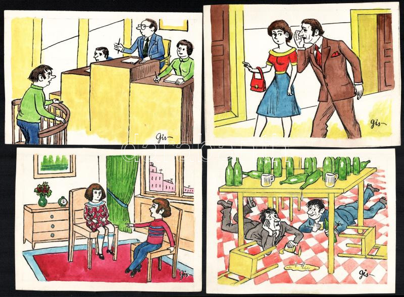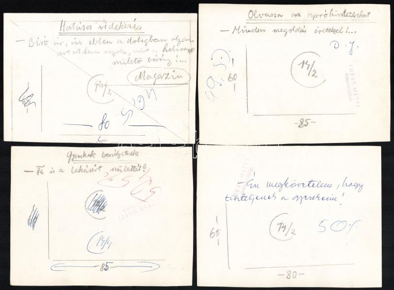 Description: Szegő Gizi (Gis), (1902-1985): Ludas Matyiban megjelent grafikák, karikatúrák vázlatai. 12 db. Vegyes technika, papír, összes jelzett. Egy kivételével mindegyik hátoldalán "Ludas Matyi Szerkesztősége" vagy "Ludas Magazin" bélyegzővel. 15x16 és 15x21 cm közötti méretekben.