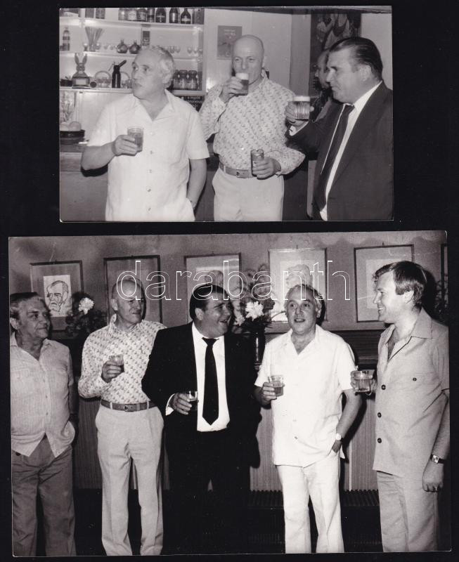 1982 Puskás Ferenc az Aranycsapat legendás labdarúgója a Thália színházban. 2 db fotó 18x14 cm, 9x12 cm