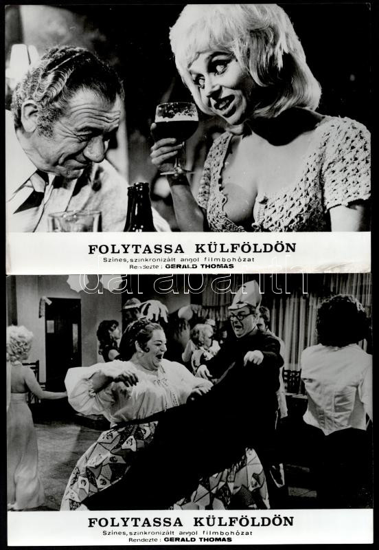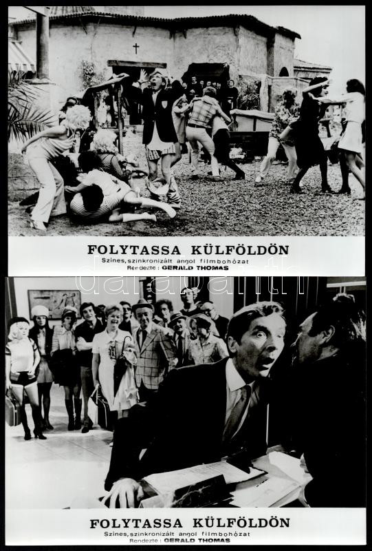 Description: cca 1972 ,,Folytassa külföldön" című angol filmbohózat jelenetei és szereplői, 13 db vintage produkciós filmfotó, ezüst zselatinos fotópapíron, a használatból eredő (esetleges) kisebb hibákkal, 18x24 cm