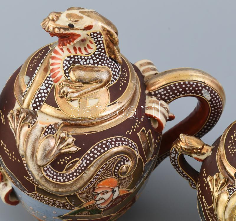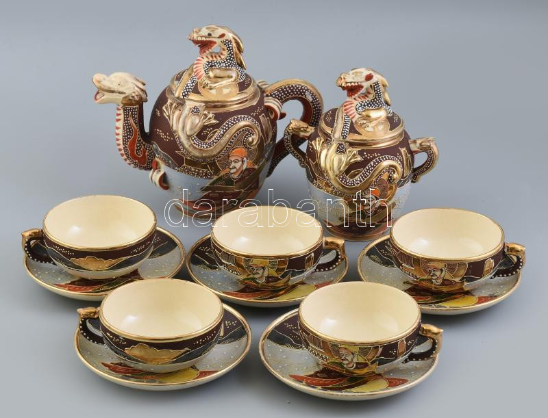 5 személyes régi japán, sárkányos teáskészlet, kopásokkal, jelzett.