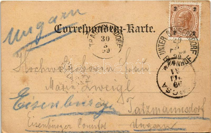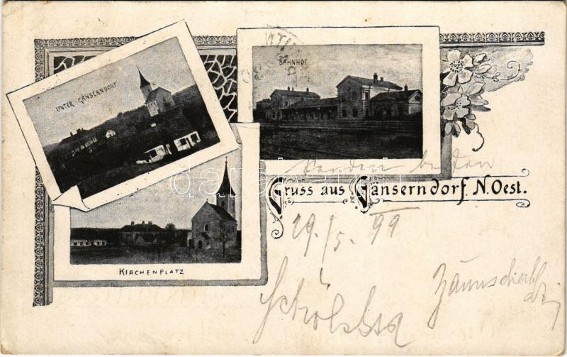 1899 (Vorläufer) Gänserndorf, Unter Gänserndorf, Bahnhof, Kirchenplatz / general view, railway station, church, square. Art Nouveau, floral (EK)