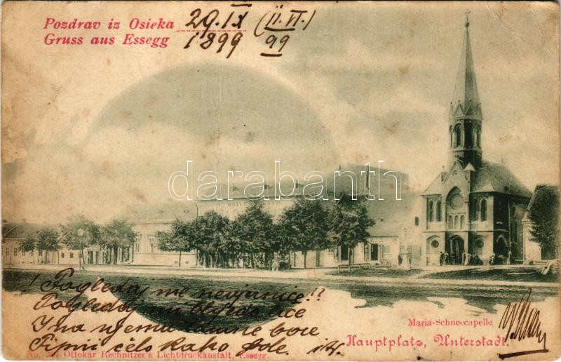 1899 (Vorläufer) Eszék, Essegg, Osijek; Hauptplatz, Unterstadt, Maria Schneecapelle / main square, chapel / Alsóvárosi fő tér, kápolna (fa)