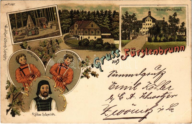 1899 (Vorläufer) Grünhain-Beierfeld, Gruss aus Fürstenbrunn. Heimstätte Förstel. Prinz Ernst, Prinz Albrecht, Köhler Schmidt / inn, restaurant, homestead. Winkler & Voigt Art Nouveau, floral, litho (fl)