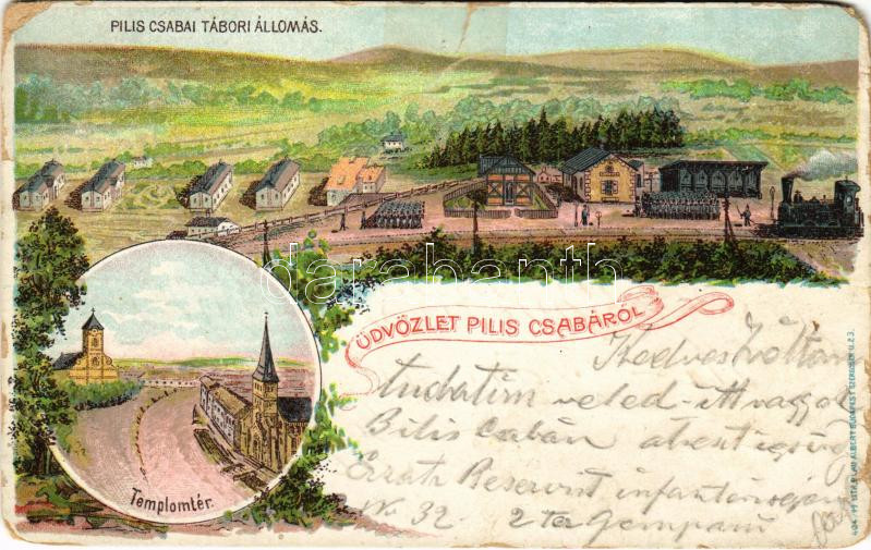 1900 Piliscsaba, Tábori vasútállomás, gőzmozdony, vonat, Templom tér. Lith. Blau Albert 404/99. Art Nouveau, litho (b)