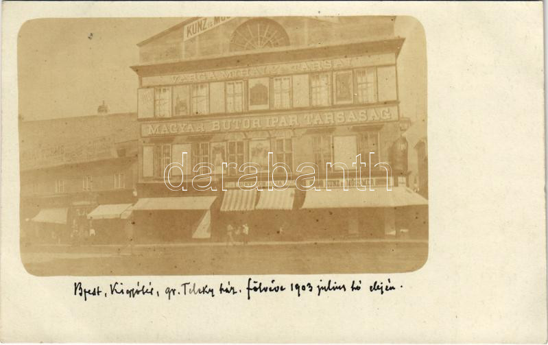 Description: 1903 Budapest V. Brudern (gr. Teleky) ház (Ennek a helyére épült később a Párizsi udvarnak is helyet adó takarékpénztár ház) a Kígyó téren (Ferenciek tere), Varga Mihály és Társai, Magyar Bútor Ipar Társaság, Kunz és Mössmer, Dietrich és fia üzlete. photo