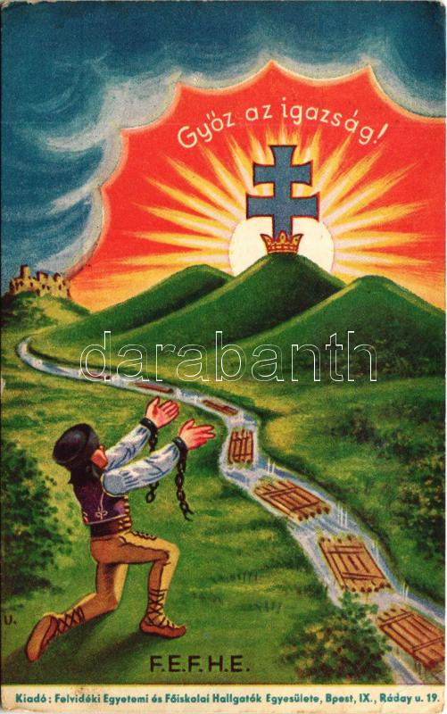 Description: 1938 Győz az igazság! Önrendelkezési jogot követelünk a Felvidék őslakosságának. Kiadja a Felvidéki Egyetemi és Főiskolai Hallgatók Egyesülete / Hungarian irredenta propaganda, Justice for Hungary! (EK)