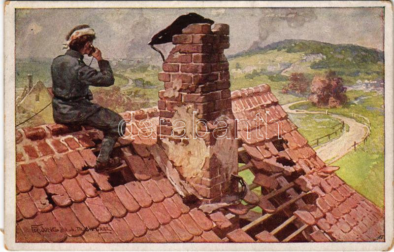 1916 Leopold Wiestl, Korporal des k.k. Landwehrinfanterieregimentes Nr. 1., verharrt, ungeachtet einer eben erlittenen schweren Verletzung, auf seinem gefährlichen Beobachtungsposten und gibt der eigenen Artillerie wichtige Zielauflkärungen. Aus dem goldenen Buche der Armee Serie IV. Offizielle Karte für Rotes Kreuz, Kriegsfürsorgeamt Kriegshilfsbüro Nr. 430. / WWI Austro-Hungarian K.u.K. military art postcard, support fund s: Fr. Jung (EK)