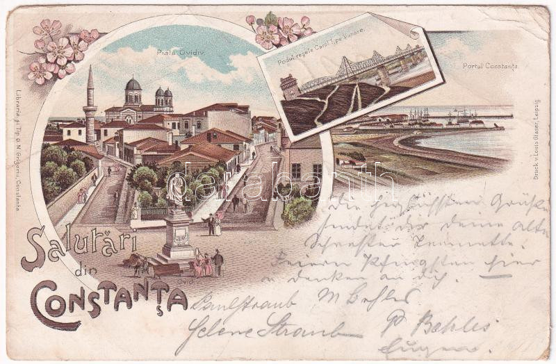 Description: 1898 (Vorläufer) Constanta, Piata Ovidiu, Podul regele Carol I per Dunare, Portul. G.M. Grigoriu / square, bridge, port. Art Nouveau, floral, litho (fa)
