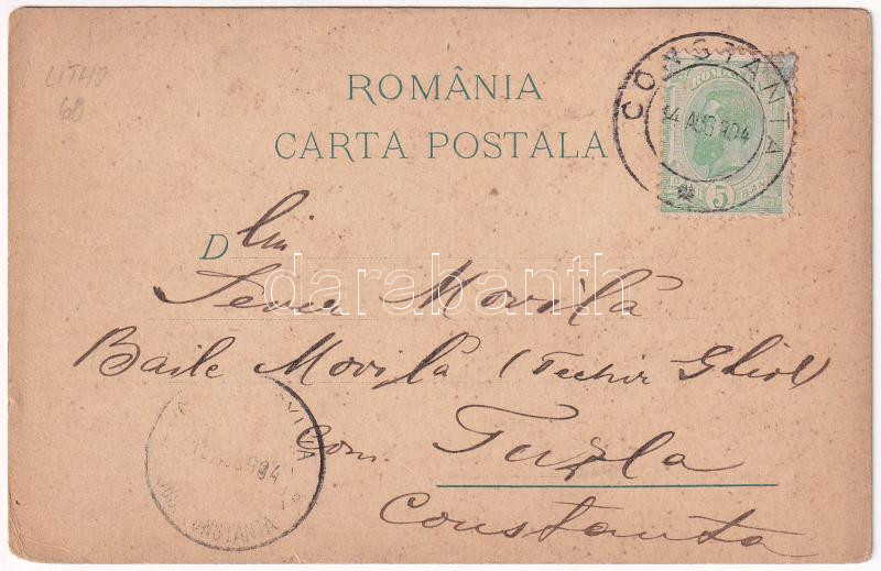 1904 Constanta, Podul Carol I. pe Dunare, Baile da le Vie. G.M. Grigoriu / bridge on the Danube, beach. Art Nouveau, floral, litho (EK)
