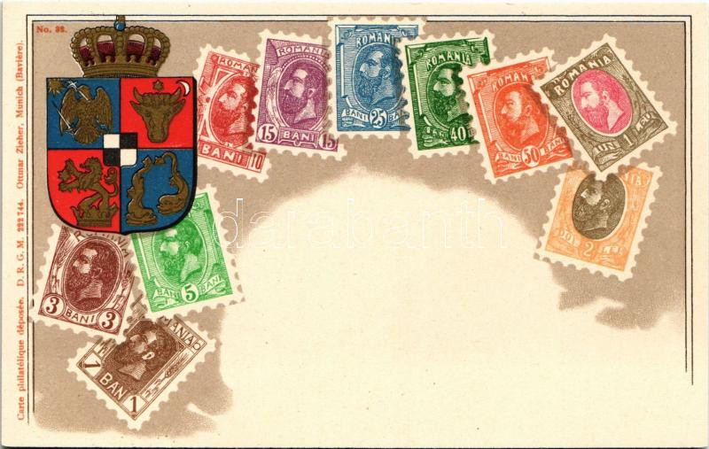 Román bélyegek és címer / Romanian stamps and coat of arms. Carte philatelique Ottmar Zieher No. 32. Art Nouveau, litho