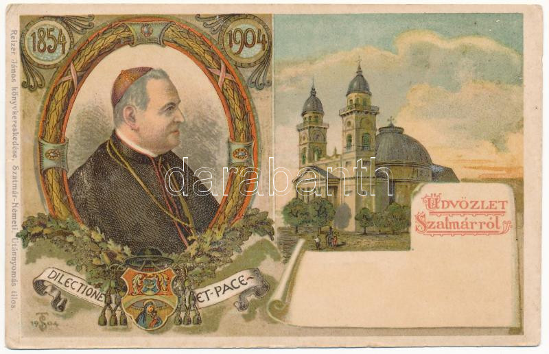 Description: 1854-1904 Szatmárnémeti, Satu Mare; Dilectione et pace / Római katolikus székesegyház, Meszlényi Gyula püspök. Reizer János kiadása / Roman Catholic cathedral, bishop. Art Nouveau, floral, litho (EK)