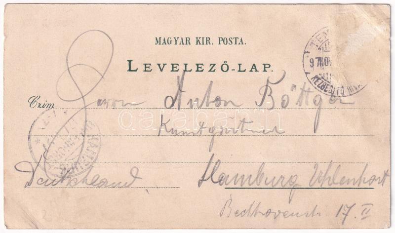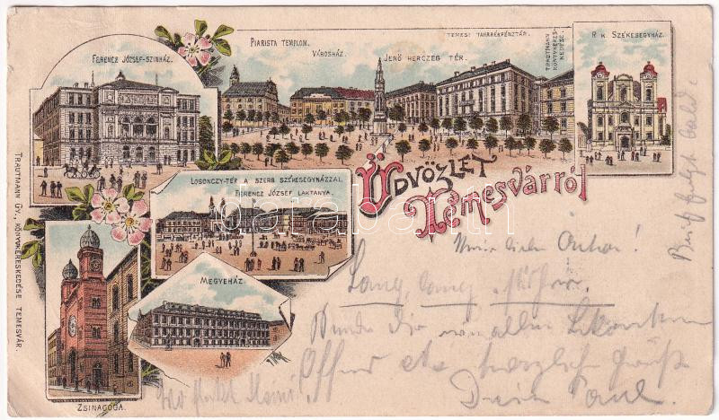 1897 (Vorläufer!) Temesvár, Timisoara; Ferenc József szÃnház, Piarista templom, Városháza, JenÅ‘ herceg tér, Temesi Takarékpénztár, Római katolikus székesegyház, Losonczy tér, Szerb székesegyház, Ferenc József laktanya, Megyeház, zsinagóga, Trautmann üzlete és saját kiadása / theatre, church, town hall, square, savings bank, Catholic cathedral, Serbian Orthodox cathedral, K.u.K. military barracks, county hall, synagogue, publisher's shop. Art Nouveau, floral, litho (Rb)