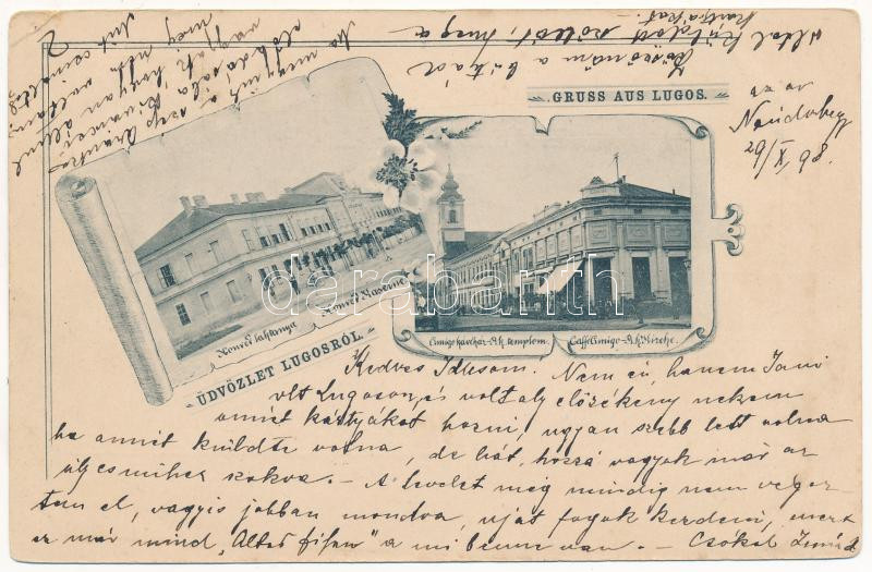 Description: 1898 (Vorläufer) Lugos, Lugoj; Honvéd laktanya, Amigo kávéház, római katolikus templom / K.u.k. military barracks, cafe, church. Art Nouveau, floral (EK)