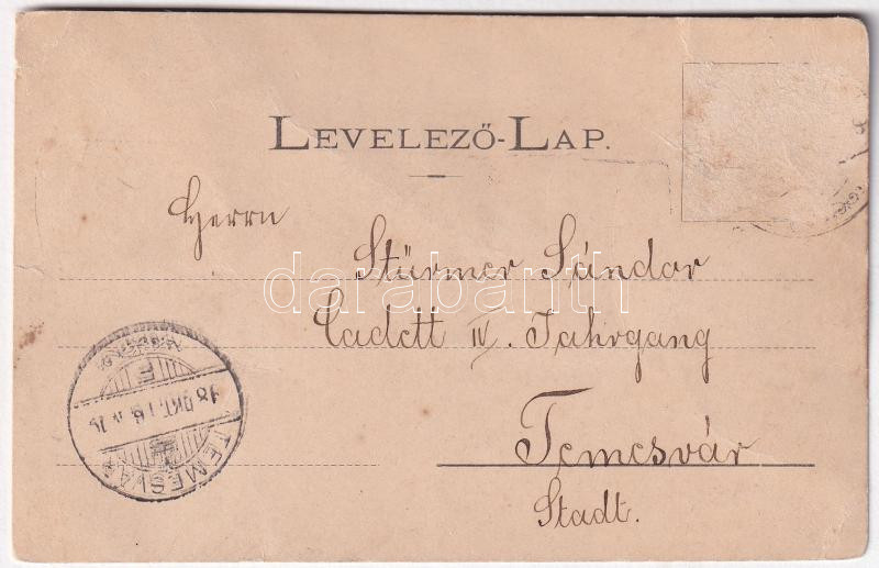 1898 (Vorläufer) Oravicabánya, Oravica, Oravicza, Oravita; Marktplatz, Röm. kath. Kirche, Comunal Bürgerschule, Montanbahn Krasova Tunel, Aerarische Amts-Gebäude / Piactér, Római katolikus templom, Polgári iskola, Hegyi vasút alagútja Krassóvárnál, Kincstári hivatalok épülete. Kehrer kiadása / market square, Catholic church, school, mountain railway tunnel near Carasova. Art Nouveau, floral (Rb)