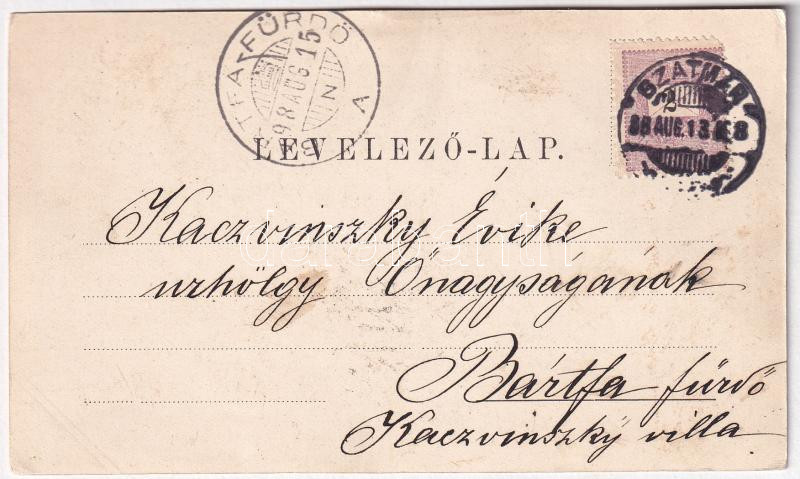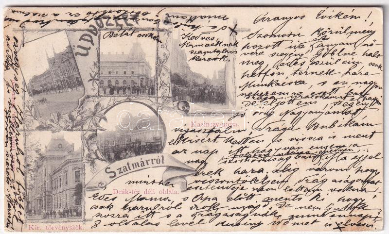 Description: 1898 (Vorläufer) Szatmárnémeti, Szatmár, Satu Mare; Kazinczy utca, Deák tér déli oldala, Kir. Törvényszék. Reizer János kiadása / street, square, court. Art Nouveau, floral (EK)