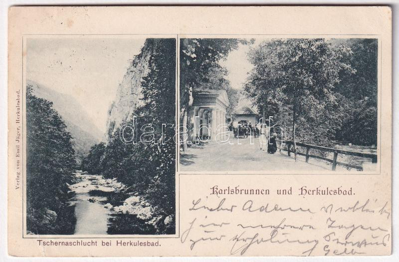 1899 (Vorläufer) Herkulesfürdő, Baile Herculane; Tschernaschlucht bei ... https://www.darabanth.com/en/436-Online-auction/436.0/Postcards/Transylvania~2000005/1899-Vorlaufer-Herkulesfurdo-Baile-Herculane-Tschernaschlucht-bei-Herkulesbad-Karlsbrunnen-~II2826156