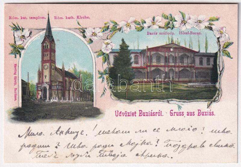 1902 Buziás, Római katolikus templom, Bazár szálloda. Herrling Károly ...