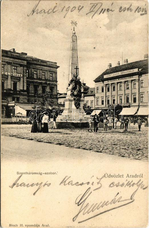1904 Arad, Szentháromság szobor, szálloda és kávéház. Bloch H. kiadása...