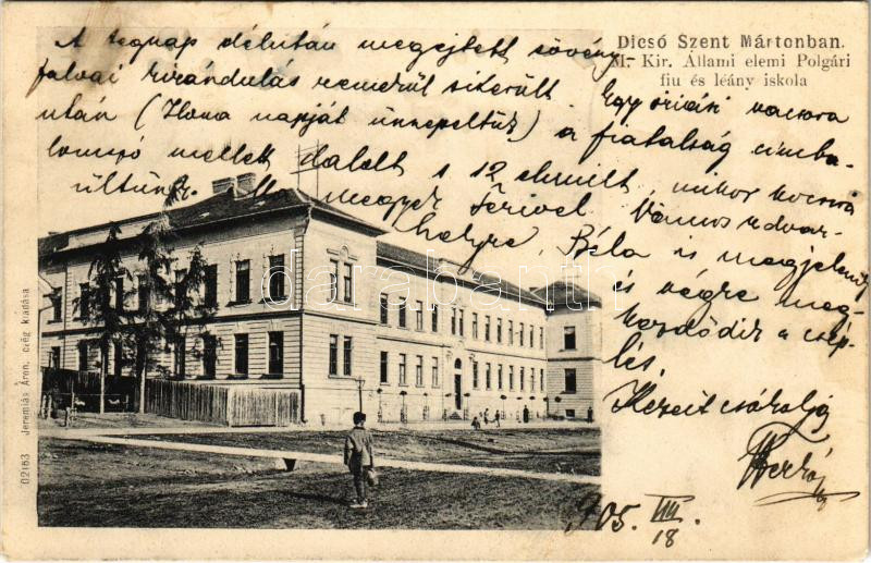 1905 Dicsőszentmárton, Tarnaveni, Diciosanmartin; M. kir. állami elemi polgári fiú- és leányiskola. Jeremiás Áron kiadása / school (fl)