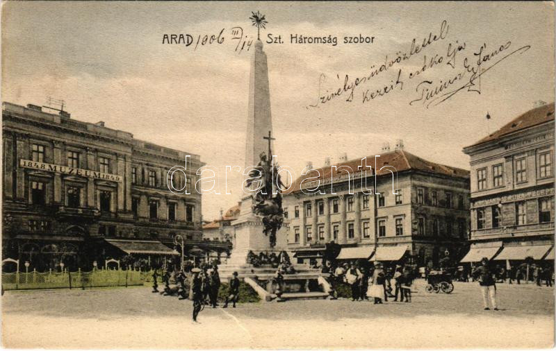 1906 Arad, Andrássy tér, Szentháromság szobor, 1848-1849 Múzeum, Nagy Lajos szállodája a Fehér kereszthez, kávéház, Fonciere biztosító társaság. Kerpel Izsó kiadása / square, Holy Trinity statue, hotel and café, museum, insurance company (szakadás / tear)