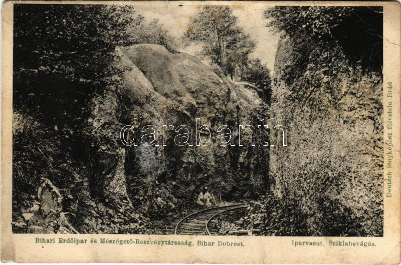 Description: 1909 Bihardobrosd, Dobrest-Govoresd, Dobresti; Bihari Erdőipar és Mészégető Részvénytársaság, iparvasút a sziklabevágással. vasúti sín. Deutsch fényképész felvétele / Industrial railway of the Bihor Wood Industry and Limestone Company (fa)