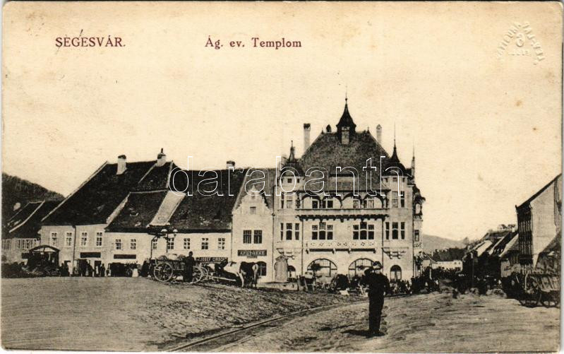 1915 Segesvár, Schässburg, Sighisoara; Evangélikus templom, gyógyszertár, Josef Girscht üzlete, piac / church, square, shops, pharmacy, market (EK)