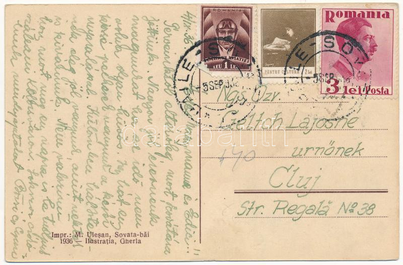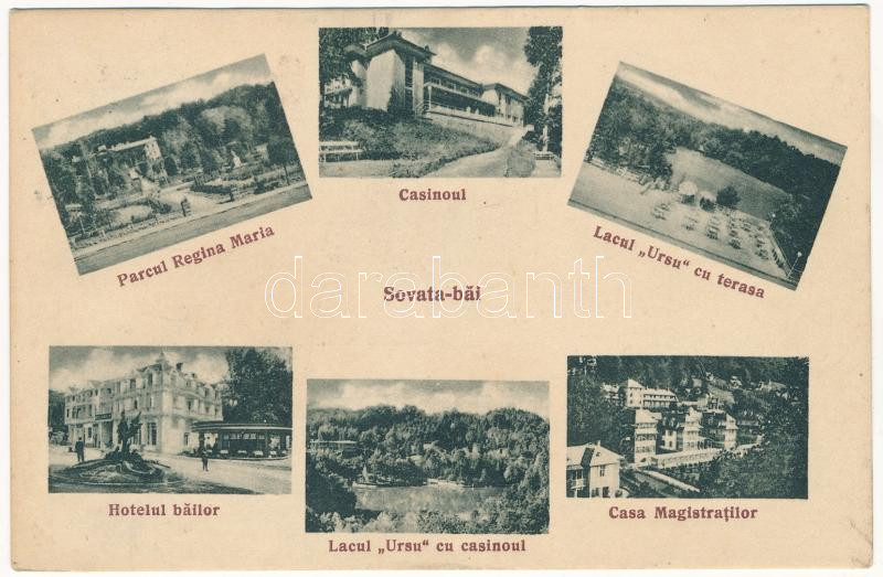 1936 Szováta-fürdő, Sovata bai; Parcul Regina Maria, Casinoul, Hotelul Bailor, Lacul Ursu cu terasa, Casa Magistratilor / fürdő szálloda, park, kaszinó, villa / spa hotel, park, casino, villas (ázott sarok / wet corner)