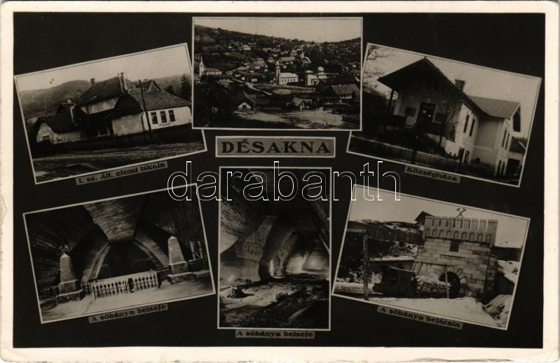 1942 Désakna, Ocna Dejului; I. sz. állami elemi iskola, községháza, sóbánya belseje és bejárata, iparvasút, vonat / school, town hall, salt mine entry and interior, industrial railway, train (EK)