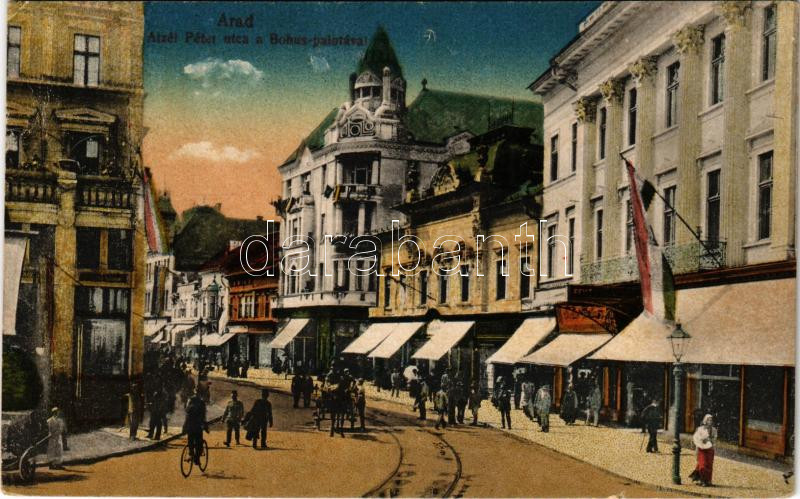 https://www.darabanth.com/en/436-Online-auction/436.0/Postcards/Transylvania~2000005/Arad-Atzel-Peter-utca-Bohus-palota-magyar-zaszlok-street-palace-shops-Hungarian-flags-f~II2831807