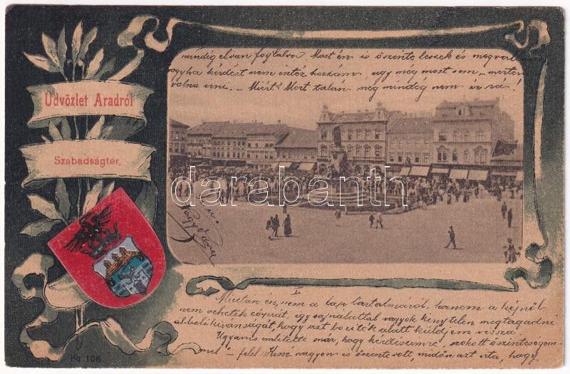 Arad, Szabadság tér, piac, üzletek. Szecessziós címeres litho keret / ...