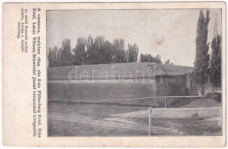 Description: Arad, Vársánc melyben 1849. október 6-án Pöltenberg Ernő, Kiss Ernő, Lázár Vilmos és Schweidel József vértanúkat kivégezték. Az aradi Kossuth szoboralapra, kiadja a Gyűjtőbizottság / castle rampart where the martyrs were killed, Hungarian Revolution of 1848-1849 (ázott / wet damage)