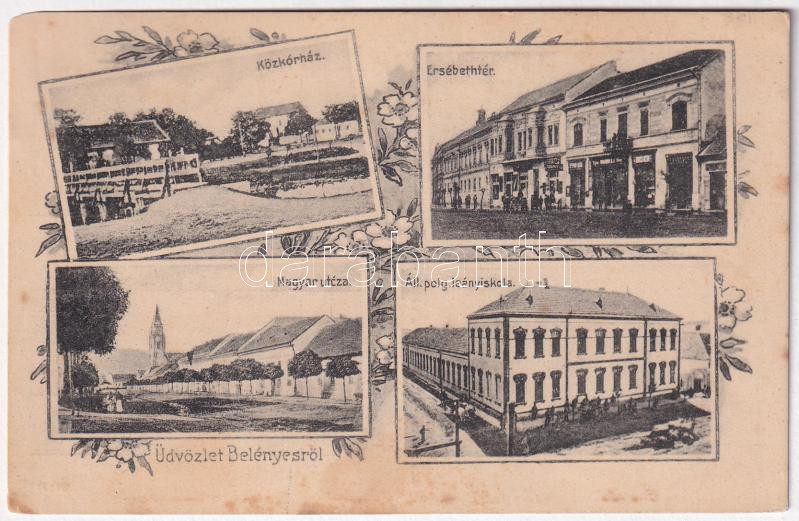 Description: Belényes, Beius; Közkórház, Erzsébet tér, Magyar utca, Állami polgári leány iskola. Süssmann Lázár kiadása / hospital, square, street, girl school. Art Nouveau, floral (fl)