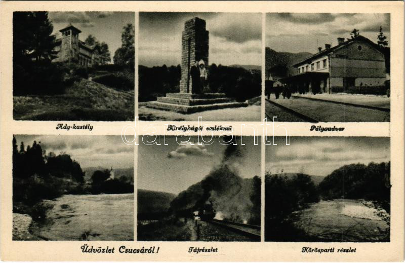 Csucsa, Ciucea; Ady kastély, Királyhágói emlékmű, Pályaudvar, vasútállomás, Táj részlet, gőzmozdony, vonat, Körös-parti részlet / castle, monument, railway station, locomotive, train, Cris riverside (EK)