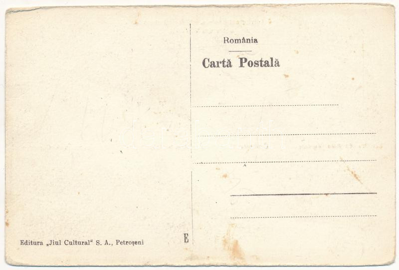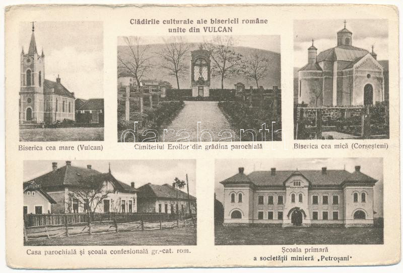 Vulkán, Zsivadejvulkán, Vulcan; Biserica cea mare, Cimiteriul Eroilor din gradina parochiala, Biserica cea mica (Corsesteni), Casa parochiala si scoala confesionala gr.-cat. rom., Scoala primara a societatii miniera Petrosani / nagy templom, a plébániakertben a Hősök temetője, kis templom, plébánia és a román görög katolikus iskola, petrozsényi bányásztársaság általános iskola / churches, parish, schools (EK)