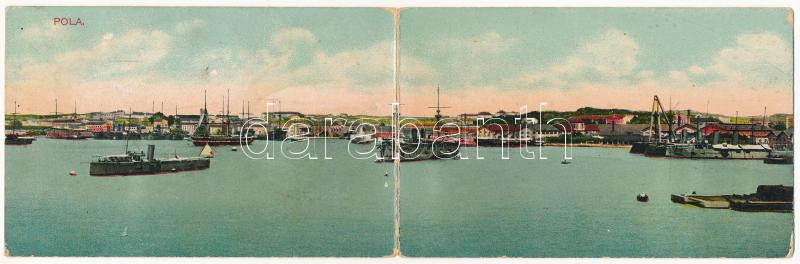 1916 Pola, Pula; K.u.K. Kriegsmarine Kriegshafen / Osztrák-magyar haditengerészeti kikötő / Austro-Hungarian Navy port and naval base, shipyard. G. Fano 1909. No. 73. - 2-részes kinyitható panorámalap / 2-tiled folding panoramacard (EK)